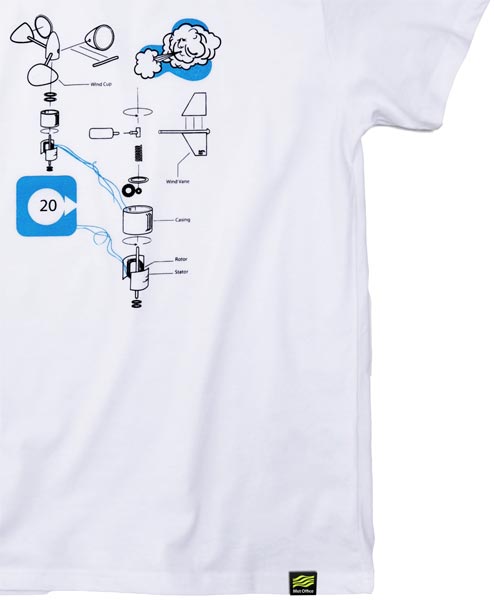 fig.: The illustration by Mart Drake-Knight (co-founder and designer at Rapanui) on the t-shirt is inspired by the science and history of the Met Office. The eco-fabrics are sewn together in a wind powered factory.