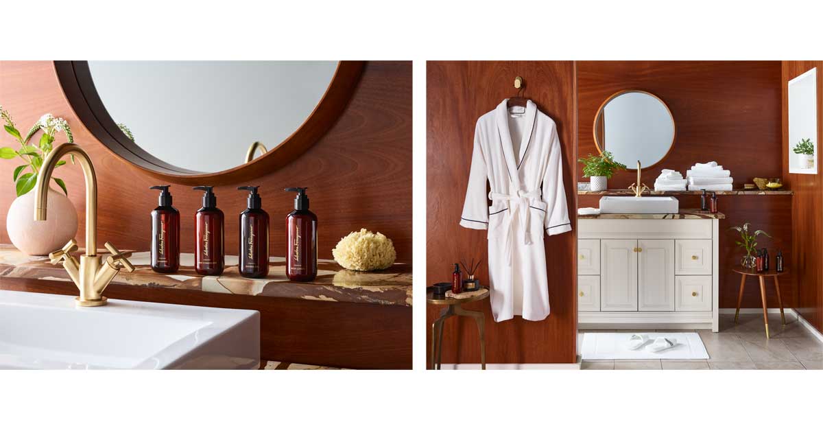 Images, from left: The pictures show the Salvatore Ferragamo Convivio Bath & Body Set and the Velour Shawl Collar Bathrobe from the new virtual Kempinski Boutique. The online shop with a range from furnishing to home textiles and bath & spa products opened officially on 16 December 2022 at kempinskiboutique.com. Photos: © Kempinski Hotels.