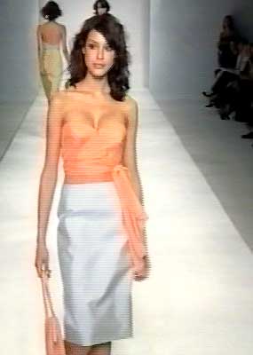 papaya, mango, apricot and soft lime perversely complement sharply-tailored skirts in cloud-blue, lavender and butter
