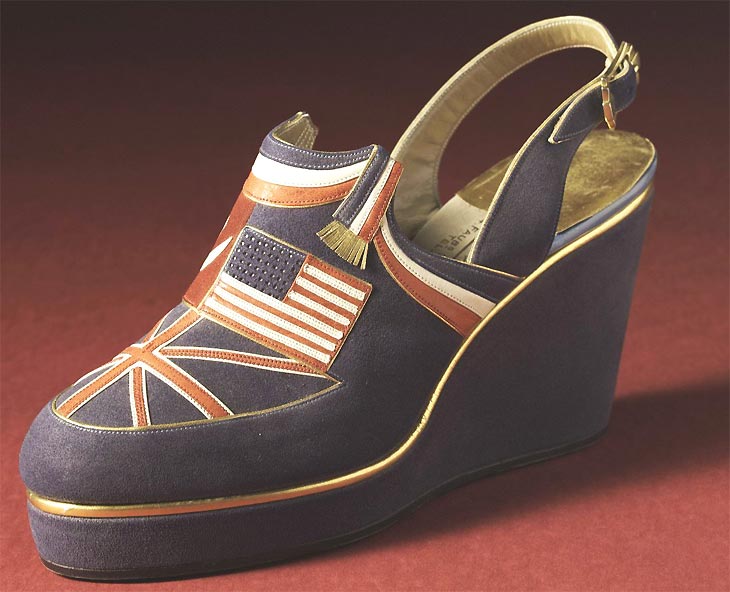 fig.: 'Accessories and Artefacts: Women's Lives in Paris 1940–1944' au Mémorial du Mal Leclerc - Musée Jean Moulin Di Mauro, sandale en daim « Les Quatre Grands » décorée du drapeau des Alliés, 1944 © S. Piera / Galliera / Roger-Viollet.