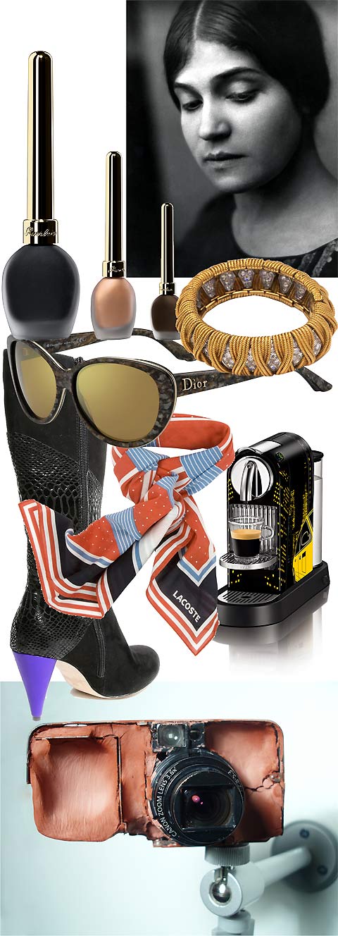 The following 'Women Style' with beauty, fashion, jewellery, and lifestyle pieces in vintage design is inspired by three exceptional women who changed the thinking through their visual and literary work during the 20ies to the 50ies. All three had been pioneers. Connections between them can be found online: the avantgarde filmer Maya Deren featured the pre-blogger (diarist) and 'difference feminism'-theorist Anais Nin in the short movie 'Ritual in transfigured time' (1946). The third woman is Tina Modotti, who documented the lifestyle of Mexican women in the 1920s. Her portray can be found on the cover of Anais Nin's published diaries 'Delta of Venus'. What makes the difference between flaring stars and the burning ideas of these women? It’s the same like with good design: it doesn't come out of fashion. fig.: beginning with the... Portrait Tina Modotti, San Francisco, 1921. Photo: Johann Hagemeyer. (C) Galerie Bilderwelt, Berlin. The photographer Tina Modotti (born 1896 in Italy, died 1942 in Mexico) became known for her documentaries about the life of women in Mexico in the 1920ies, especially the series 'Women of Tehuantepec', and her involvement into the revolutionary movements during the 30ies. You will find many romantic video-biographies and slideshows on YouTube which express the people's adoration for the artist. The Viennese 'Kunst Haus Wien' exhibits the work of Tina Modotti under the title 'Photographer and Revolutioner' from 1 July until 7 November 2010. Eyeliner in Métal d’Or, Noir Ébène, and Encre Brune by Guerlain, 2010. The packaging designers had been inspired by the brushes for calligraphy. The result is a very fine brush on a long stick. Tip: begin to draw the line from the middle of the lid near by the lashes. 'Sabre japonais' bracelet, yellow gold and diamonds, from the Van Cleef & Arpels Collection 1958. On 12 May 2010, the bracelet from 1958 was worn by actress Cate Blanchett to a pale pink Armani Privé couture dress during her interviews to introduce her new movie 'Robin Hood' in Cannes. Even Cate Blanchett is a woman who causes romantic videos on YouTube. Shades 'Bagatelle' in 50s style by Dior, 2010. Snake/leather boot with indigo 'statement heel' in 1960’s futurism- classic look by Rakish Heels, FW 2010/11. Rakish Heels (launched February 2008) designs under the ethos to avoid producing throwaway, one-season fashion. The pieces are created to have long lasting appeal. Some of the boots are fitted out with heel covers. The covers are not only protecting the heels, they allow to personalise the footwear. Colorful golf or tennis scarf by Lacoste, SS2010. Photo: (C) Lacoste. In 1933, Lacoste was founded by the French tennis player René Lacoste. The label's heritage influences the signature elegant-sportive design of the scarf on this page. EN 165.Y CitiZdot New York Edition (limited) by De'Longhi in cooperation with Nespresso, 2010. The retro-American-comics illustration by artist Lo Toth shows a yellow cab and skyscrapers. All CitiZ machines are inspired by international capital cities. The design line with special limited editions (CitiZdot) premiered in 2009. 'Photomodel' by US artist Andres Laracuente (born 1982 in Texas, living in New York) whose work is on show under the title 'The Eyes Have No Cash' from 29 April to 29 May 2010 at the Galerie Yukiko Kawase in Paris. Fashionoffice has received for the exhibition, which focuses on obsessive desires, anxiety, and reflections on the word 'model' in our world, following video invitation. |