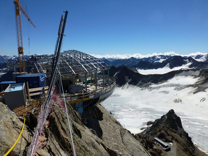 fig.: The mountain station of the new 'Wildspitzbahn' with enclosed café (in- and outdoor space of the gastronomy for around 160 guests) by architect Carlo Baumschlager (team Baumschlager Hutter Partners) is built in 3.440 metres height on the 'Hinteren Brunnenkogel' at the glaciers in the alps in Pitztal in Eastern Tyrol. It is the highest culinary point in this region. The opening is scheduled for mid-October 2012. Photo: Pitztaler Gletscherbahn. 'Glacier café' on 3.440 metres In mid-October 2012, the cable car and mountain station 'Wildspitzbahn' with enclosed café in 3.440 metres height will open at the glaciers in Pitztal in Tyrol, Austria. The new cable car brings mountain fans in gondolas (each carries 8 persons and their sports equipment like skis and snowboards) to Austria's highest nature ropes. The two kilometres gondola tour begins in the valley station in 2.840 height. It is announced that the gondolas arrive in five minutes and 40 seconds at the new mountain station on 3.440 metres. Sounds like a nice destination for one 'glacier café' with panorama view! |