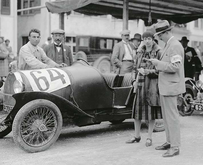 fig. original: Ms Elsässer from Bellinzona and her 1,5 litre Bugatti at the mountain car race in 1926. Photo: (C) OK Klausenrennen.
