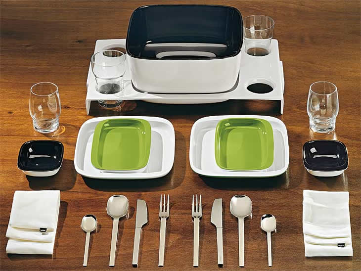 The picknick set for two offers 1 large salad bowl, 2 large square plates, 2 flat, rectangular plates for side dishes, 2 little bowls for dips, 2 large and 2 small glasses, and dishes, ... in a bag in the culinaric color Coffee with Orange interior. Urban Chill Box >>>