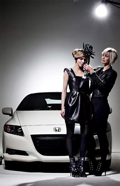 In early March 2011, Honda presented head-couture designed by British jewellery designer Rachel Galley from parts of the sporty hybrid coupé CR-Z such as the grille and added red, blue and green crystals in between - the colored stones stand for the 3-mode drive system: green for Econ, blue for Normal and red for sport.
