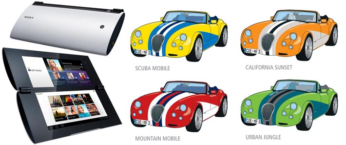 fig. left below: Sony Tablet P (runs Android Honeycomb, weight 372g) has the appeal of a magazine. The 5,5'' dual-screen (can be used separately or as one display) looks folded like a clutch (79x180x26mm). It has integrated cameras on the front- and backside and various apps such as Google Voice Search. The Sony Tablet P will be presented at IFA (Consumer Electronics trade show in Berlin, 2 - 7 September 2011); arrives on the market in November 2011.