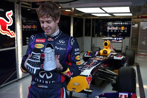 Abb. rechts: Das Foto zeigt den dreifachen und derzeit amtierenden Formel 1 Weltmeister Sebastian Vettel mit dem neuen 'Track Shoe 2013' des Infiniti Red Bull Racing Teams, der von Geox zusammen mit den Mechanikern, Techniker des Rennteams entwickelt und getestet wurde. Mitglieder des Teams wie Mechaniker oder Organisatoren legen an den Rennwochenenden hunderte Kilometer per Fuß zurück; funktionale Sohlen für Reaktionsgeschwindigkeit und Wärmeregulierung sind dabei wichtig. Aus dem Track Shoe des Formel 1 Teams ist der Xense hervorgegangen, der dieses Jahr von den Team-Mitgliedern getragen wird und weltweit im Verkauf erhältlich ist.