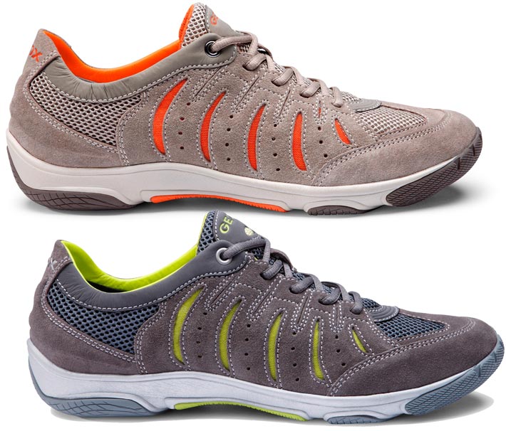 Abb. unten: Zwei Modelle aus der Xense Linie von Geox. Den Schuh gibt es in verschiedenen Farbkombinationen und Materialien (Glatt- bis Rauleder außen kombiniert mit Mesh, innen sorgt ein anpassungsfähiges Textilgewebe für Komfort; die Sohle ist mit Klima-Membranen versehen - die atmungsaktive Technologie der Sohle ist unter dem Namen 'Geox Net Systems' patentiert), F/S 2013.