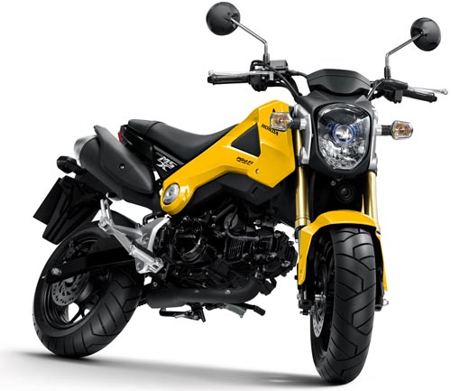 fig.: The new Honda MSX125 in 'Pearl Queen Bee Yellow', January 2013. The motorbike is available in yellow, red (Pearl Valentine Red), black (Asteroid Black Metallic), and white (Pearl Himalayas White).