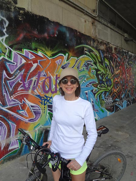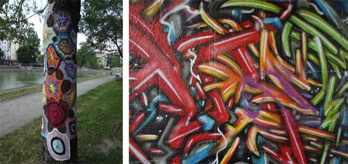 fig.: The image above shows me at the Donaukanal at the Inner City of Vienna. Below, three pictures from the official bike route along the channel of the Danube; two of them show trees decorated with crochets in grandma style. Photos captured on 18 July 2013.