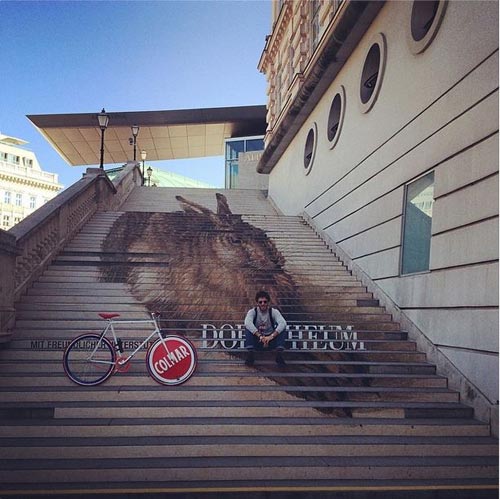 fig.: The image shows fashion-bike writer Nicolò de Devitiis sitting on the stairs of the Albertina; the stairs are illustrated with Albrecht Dürer's rabbit. Beside him, fashion label Colmar's bike which accompanies him on his city explorations of design, art, music, culinary and fashion in Europe. Photo by Thanh Dinh; provided by Colmar Originals.