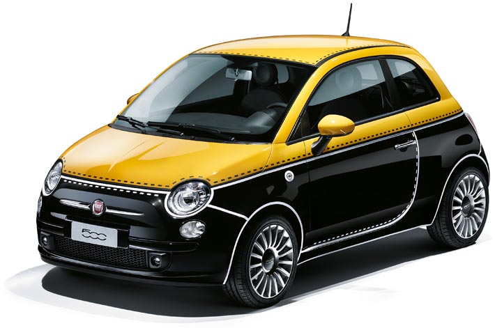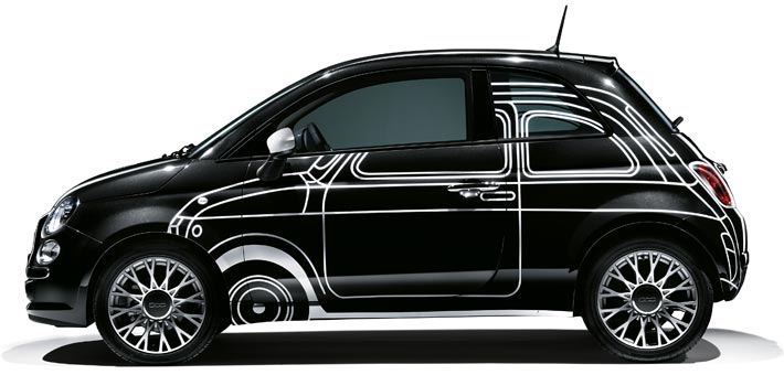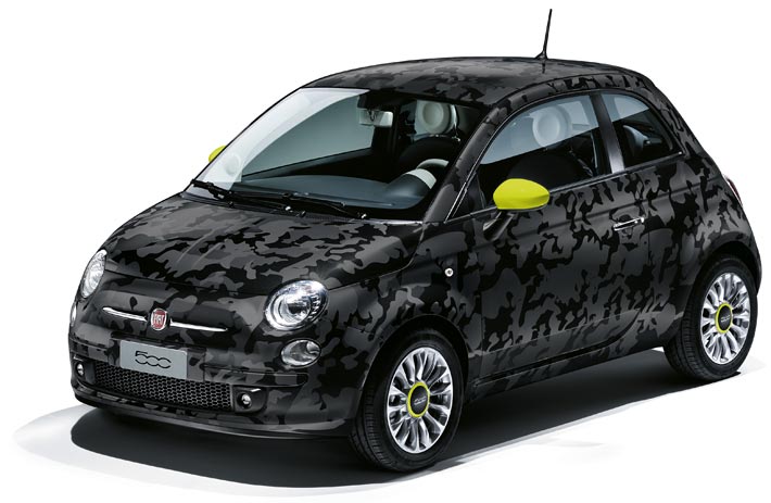 Yesterday on 30 September 2014, the new Fiat '500 Ron Arad Edition' was presented during a cocktail organized together with Condé Nast's 'L'Uomo Vogue' at the car maker's MotorVillage at Rond-Point des Champs-Elysées right in time with Paris Fashion Week as the new edition focuses on 'Couture' in the meaning of customization or individualization which is central for today's fashion. Ron Arad's creation (first image on this page) for the bodywork is one of three from the Fiat '500 Couture' line. Ron Arad references the history of the car with a sketch (white lines on black) of the first model from 1957. The second on this page is the one with thrilling dark camo pattern. The third has a funny appeal and expresses more than the others 'Couture' in the meaning of fashion technology; it's named '500 Comics' and is on view at the bottom of this page. The '500 Comics' shows painted seams on the body - such as the car is made from textile. It could also remind a stuffed toy.