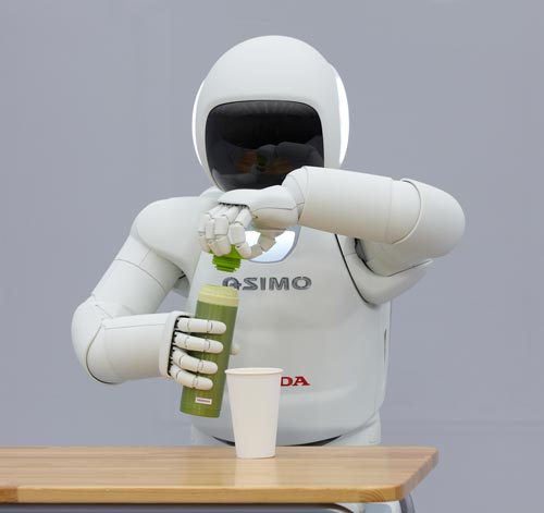 Honda's latest Asimo version is equipped with better intelligence capability and finger skills than its predecessors (researches started in 1986, first Asimo presented in 2003 in Europe). The new robot has bar keeper qualities! It can open a bottle and fill the beverage into a paper cup, is able to bring the drink (runs forwards) and can go back, climb stairs (up and down), it hops and jumps. Asimo is able to communicate via sign language and adapts the behaviour of its surrounding as it is equipped with decision-making capabilities which work in real-time. It can do so as it calculates future human behaviour (like the way the person will take). It recognizes voices and the faces of three people simultaneously which is - such as it is explained at the video below, difficult for human eyes. Honda transfers the findings of robot research to other products such as walking assistants or machines of MotoGP. Details about Asimo are published on asimo.honda.com/inside-asimo.