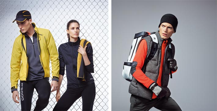 The collaborative adidas and Porsche 'Porsche Design Sport' Fall/Winter 2014 collection consists alongside to the label's classical 'Driving' items such as driver's jacket and motorsports inspired driving shoes, of outfits for 'Running' (on view on the image left) and hiking/trail running (picture right, category 'Elements'). The 'Elements' outdoor sports wear is made from functional fabrics such as wool with ThermoCool™ yarn. The line's 'Intermediate' water-resistant leather boot (men and women) with cushioned sole is one of the highlights of the new collection; the boot is on view on the website of adidas.