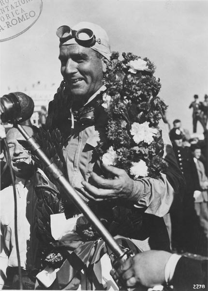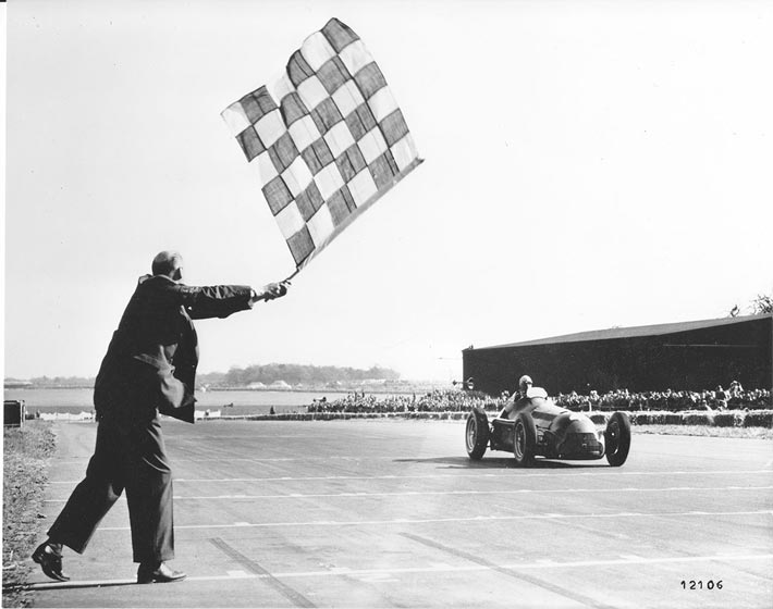 fig.: The image shows Giuseppe 'Nino' Farina who was in his Alfa Romeo Alfetta '158' the best racer on 13 May 1950 on the circuit in Silverstone. Farina won and was also awarded the first 'hat trick' of F1: pole position, victory and fastest lap. At the end of the season, Farina received the first World Champion title in Formula 1. More about the historical day is published on formula1.com.