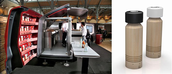 Tables, speakers etc are carried by the truck as well as the tableware. Together with the truck, Peugeot Design Lab presents the new salt and pepper mill set 'Milan'. It's announced that before it enters the market, the Milan mill set will be exclusively available at the French Pavilion during Expo Milano 2015.