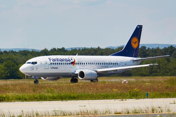 fig. above: German football team boarding 'Fanhansa' by Lufthansa from Frankfurt to Chambery Savoie Airport on 6 June 2016. Below: 'Fanhansa' taking off. The Boeing 737-300 received a special lacquer outfit with 'Fanhansa' writing and names of around 300 fans at the aircraft. The 300 fan names were selected from 65,000 online applications for flying symbolically with the team. Photos by Oliver Rösler.