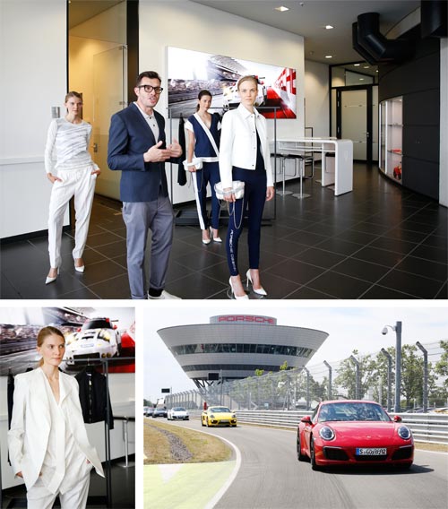 Image below left: Model in white blazer, wide blouse and trousers at the exclusive preview. Right: Porsche 911 Carrera S drive the Porsche onroad race track.