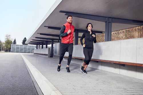 fig.: The image shows Xabi Alonso and Nagore Aranburu; Xabi Alonso wears the tailored, lightweight 'Reflective Jacket' with the all-over reflective hexagonal print (closer view) which can be found in Spring/Summer 2017 at several items of the Porsche Design Sport by adidas collection; above the reflective jacket, the water-repellent 'Padded Vest' in red, filled with PrimaLoft Gold insulation. At his legs, the running 'Seven-Eighth Tights' with reflective details and at the feet, the 'Endurance Leather 2.0' training shoe with Boost™ technology sole.