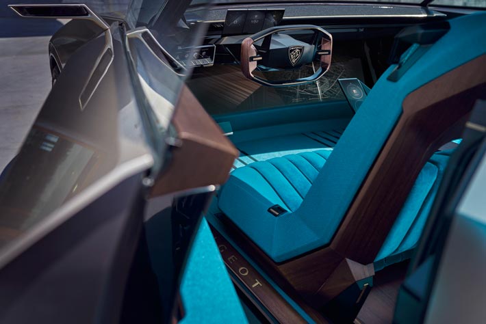 Special velvet, wood, and perfume at the autonomous, electric Peugeot 'e-Legend Concept' referencing 1960s