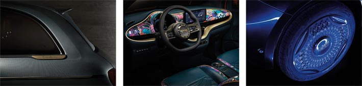 Fiat 500 'La Prima' interpreted by Armani, Bvlgari, Kartell The first fully electric FCA car, the Fiat 500 'La Prima' (up to 320 km, 5 minutes to charge for 50 km travel) premiered in three color variations referencing the environment, mineral grey for the earth, ocean green for the sea and celestial blue for the sky, and in additional three unique masterpiece editions outfitted by Armani, Bvlgari and Kartell...